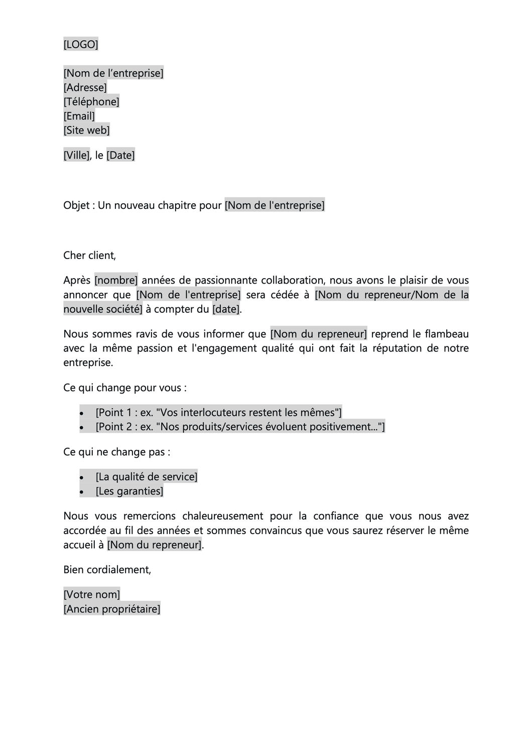 Annonce professionnelle de transmission d'entreprise. Modèle clé en main pour informer vos clients en toute sérénité.