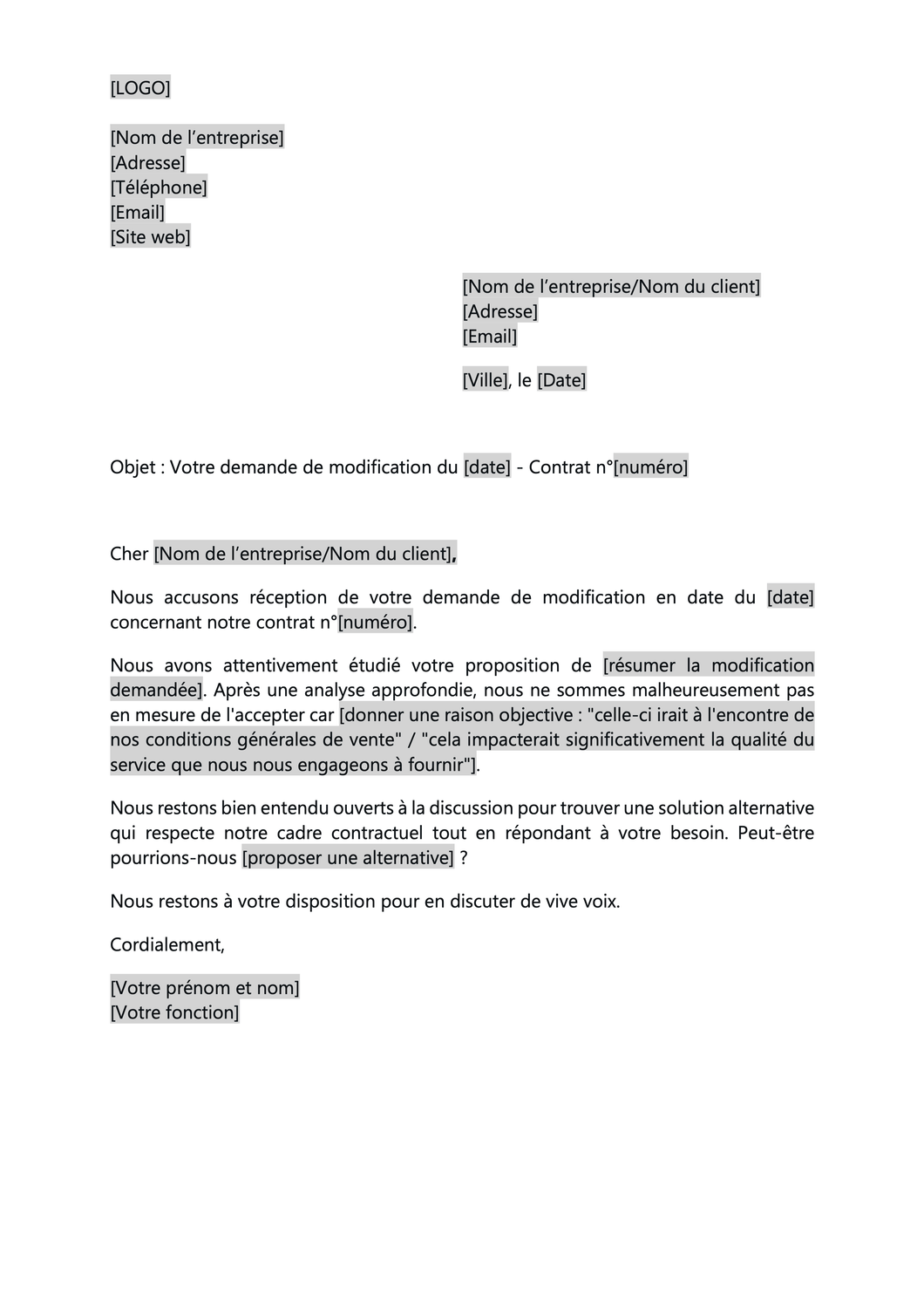 Modèle pour refuser un changement de contrat. Réponse professionnelle qui protège vos conditions tout en cherchant une solution de rechange avec le client.