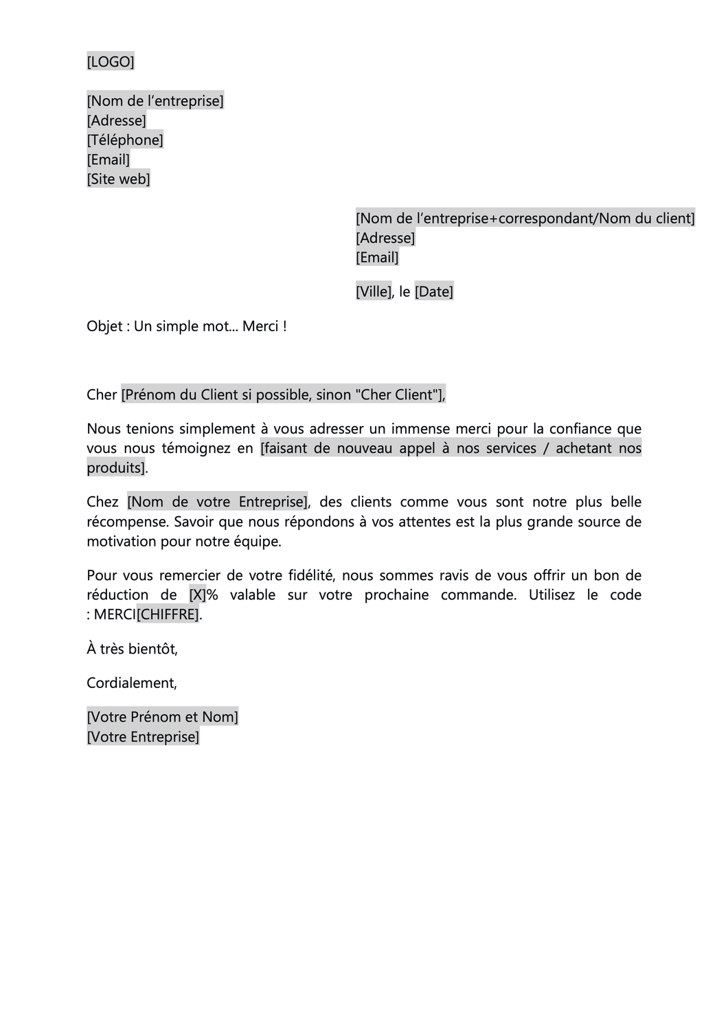 Lettre de remerciement avec offre exclusive. Modèle pour marquer votre gratitude et renforcer la fidélité de votre portefeuille client.