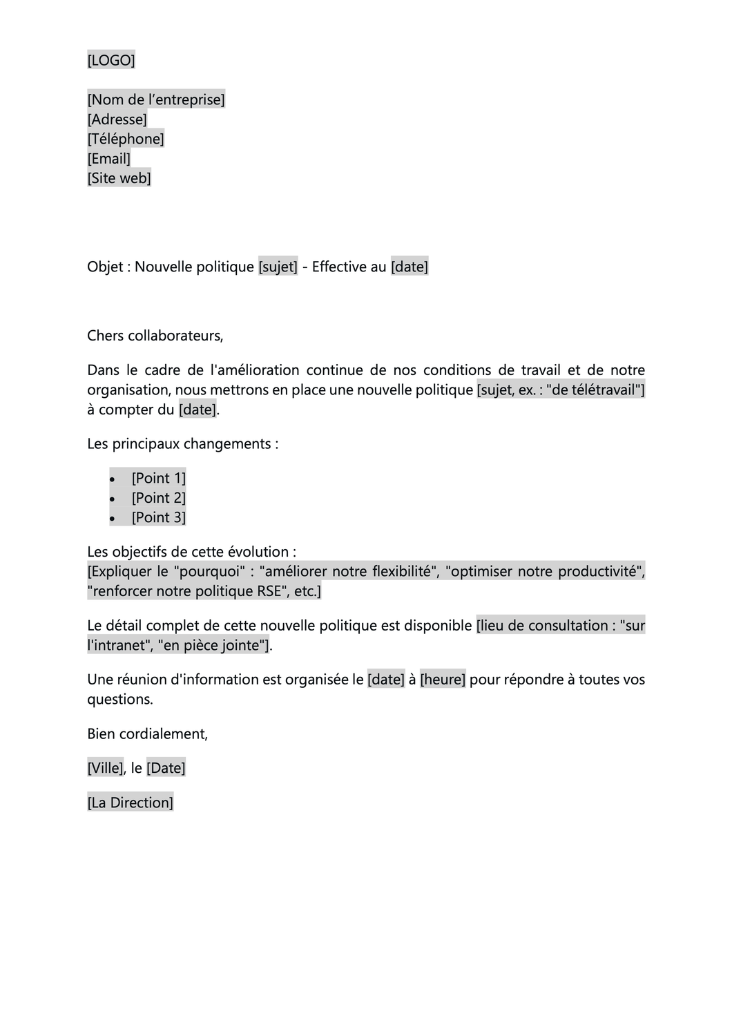 Modèle de communication pour politique interne. Annoncez un changement d'organisation (télétravail, RSE...) et ses impacts aux équipes de manière structurée.