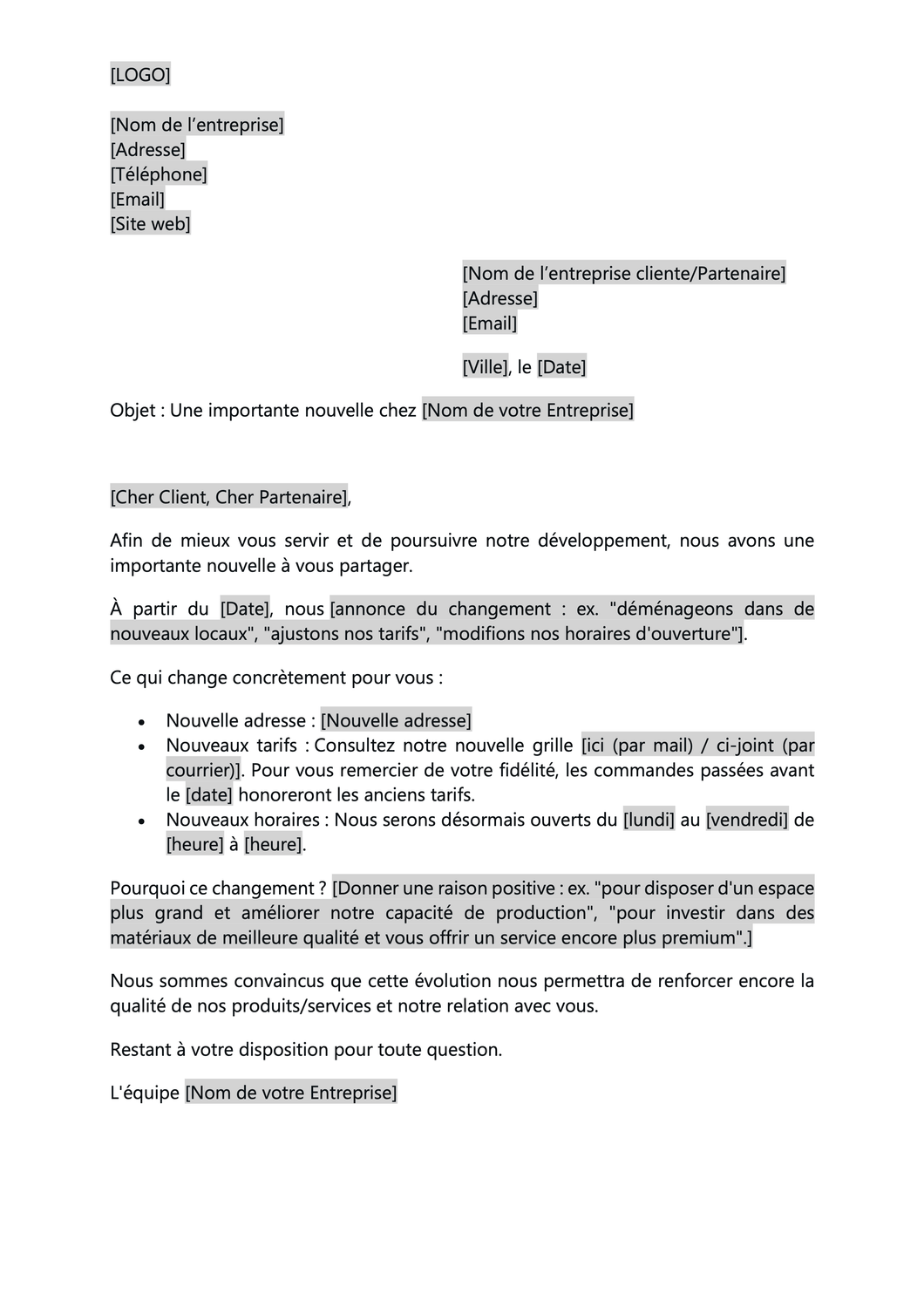 Modèle de communication pour changement d'adresse, de tarifs ou d'horaires. Annoncez une évolution positive pour maintenir la confiance.