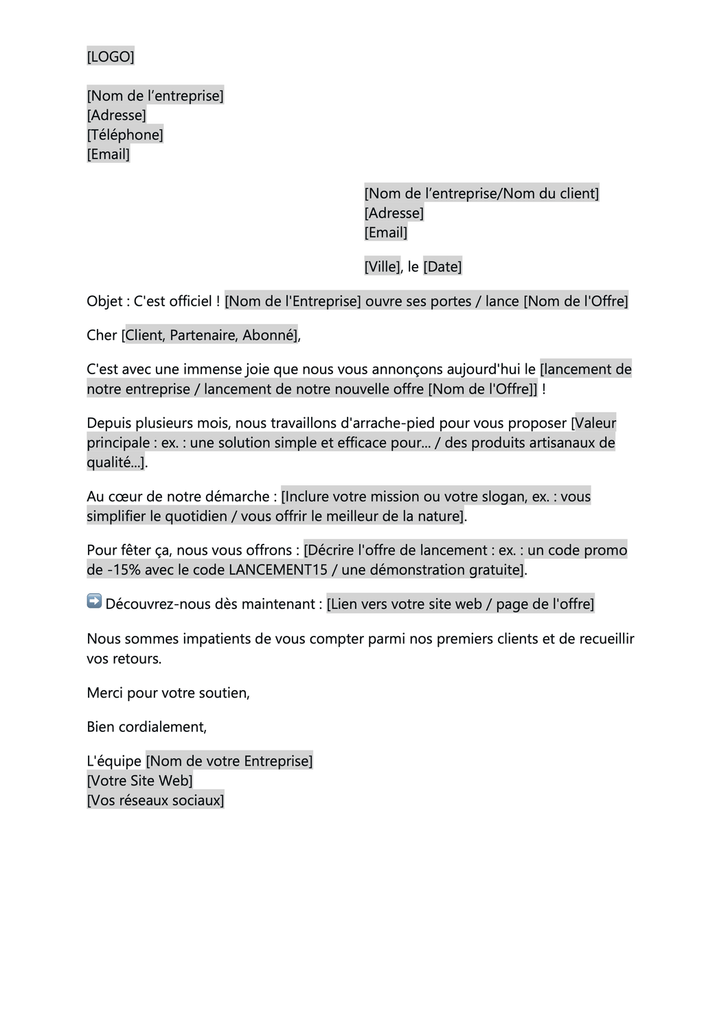 Modèle de communication pour un lancement. Annoncez une nouvelle offre avec un message engageant et une incitation à l'action immédiate.