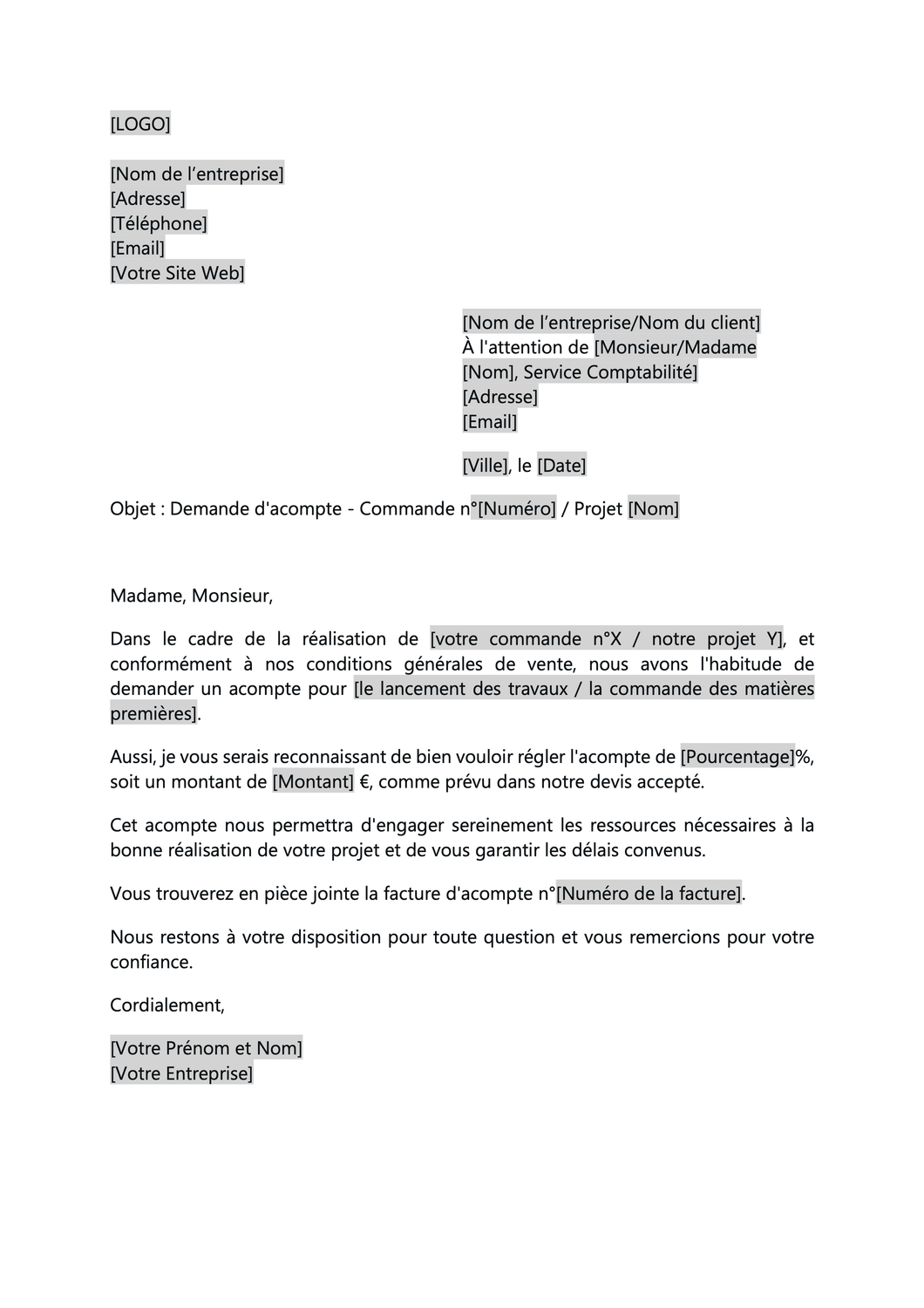Modèle de demande d'acompte. Formalisez une demande de paiement partiel pour lancer les travaux ou commander les matières premières, en toute sécurité.