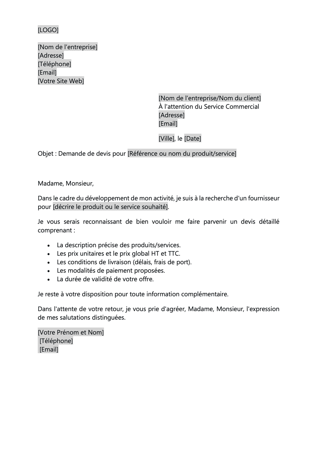 Document professionnel de demande de devis fournisseur pour obtenir une offre détaillée et comparer les prestations en vue d'un achat éclairé.