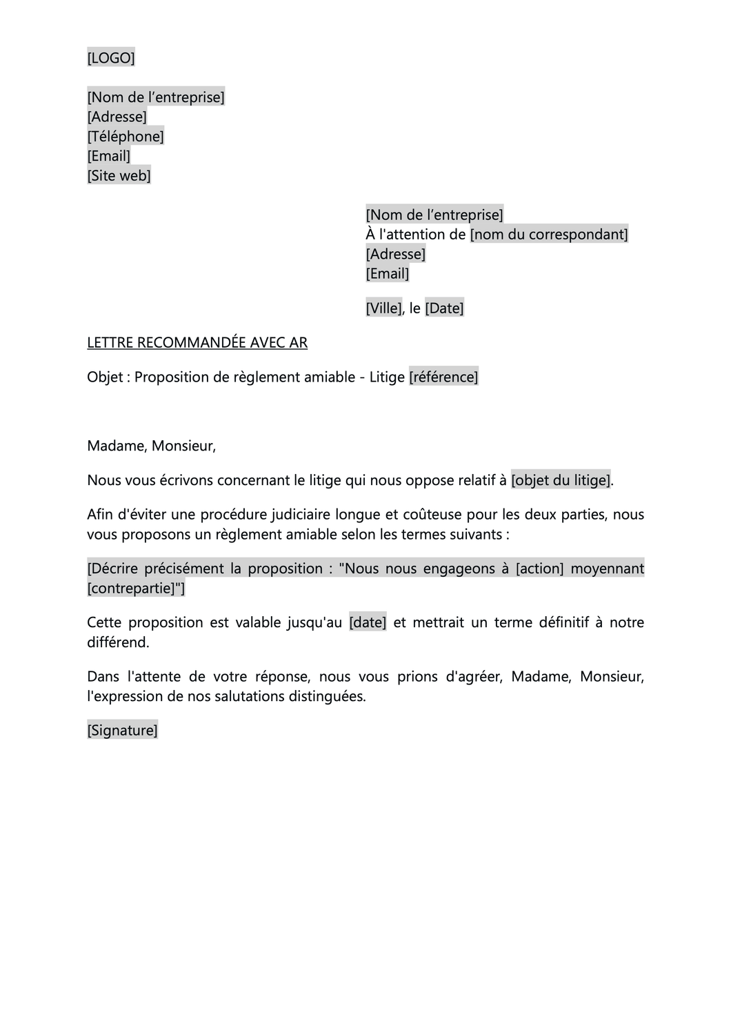 Modèle de résolution amiable d'un litige. Lettre formelle pour proposer un accord et éviter un recours en justice.