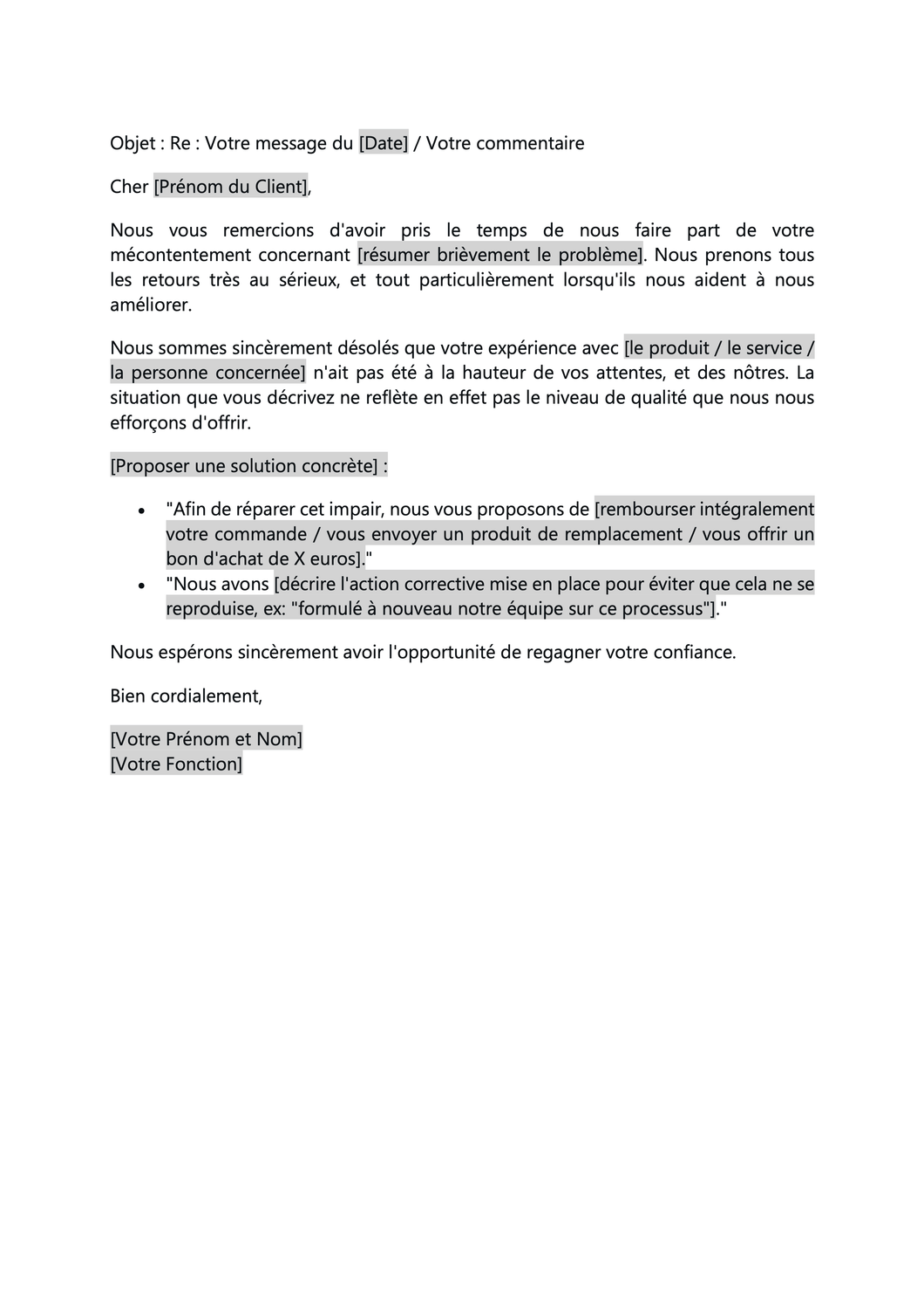 Réponse à un mécontentement client : excuses, solutions concrètes et mesures correctives.