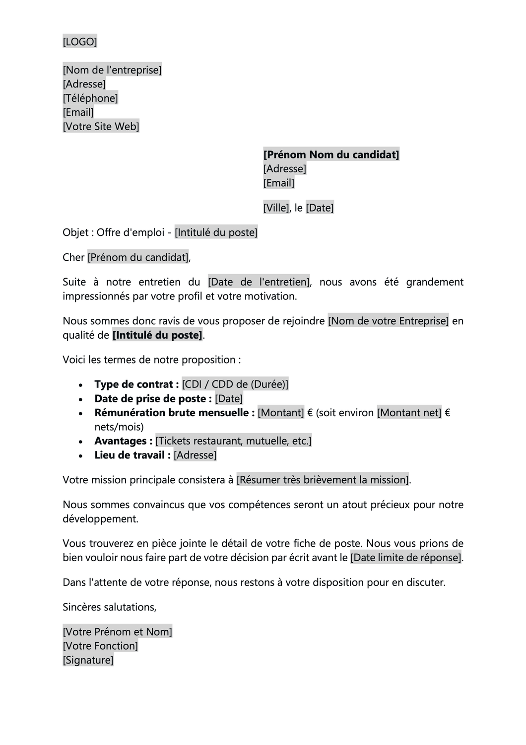 Lettre de proposition d'emploi à envoyer après un entretien. Inclut proposition de poste, détails du contrat, rémunération, avantages et date de prise de poste.
