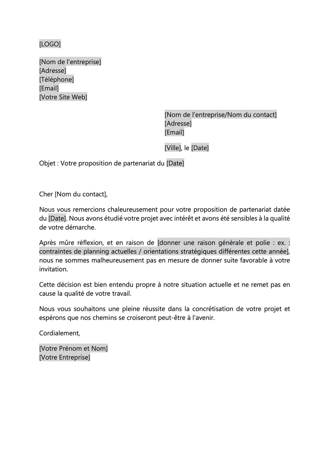 Lettre de réponse pour refuser un partenariat, pour décliner une collaboration avec tacten raison d'orientations stratégiques ou de contraintes de planning.