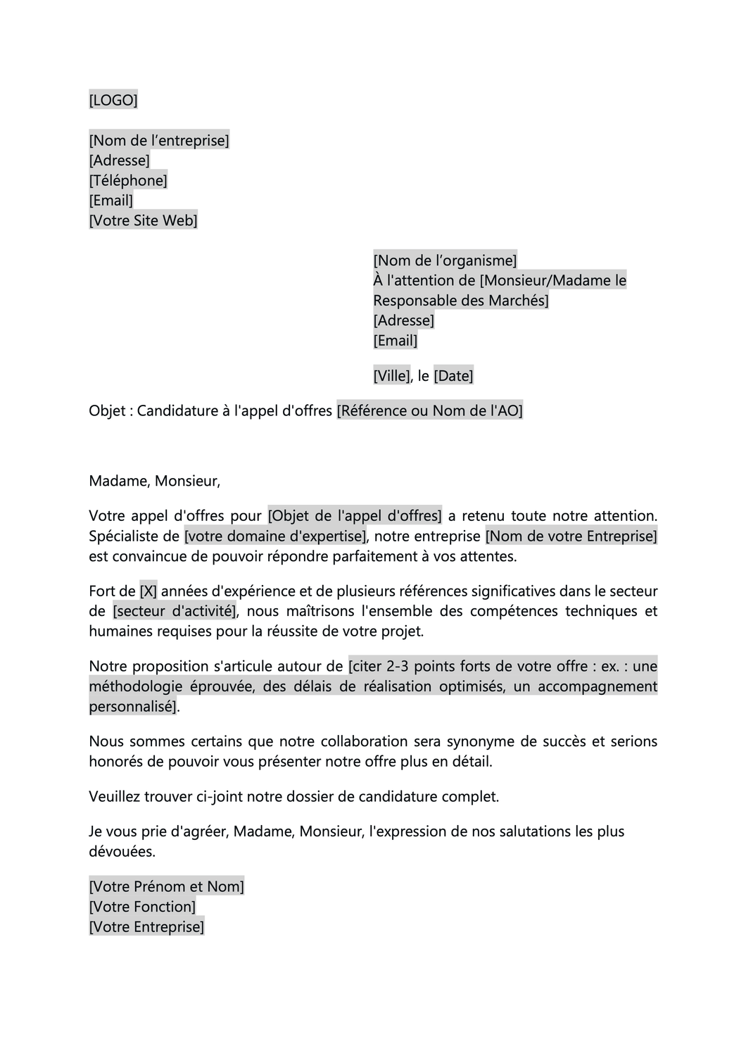Lettre de motivation pour appel d'offres, convaincante, mettant en avant l'expertise, les références et les avantages clés de votre proposition.