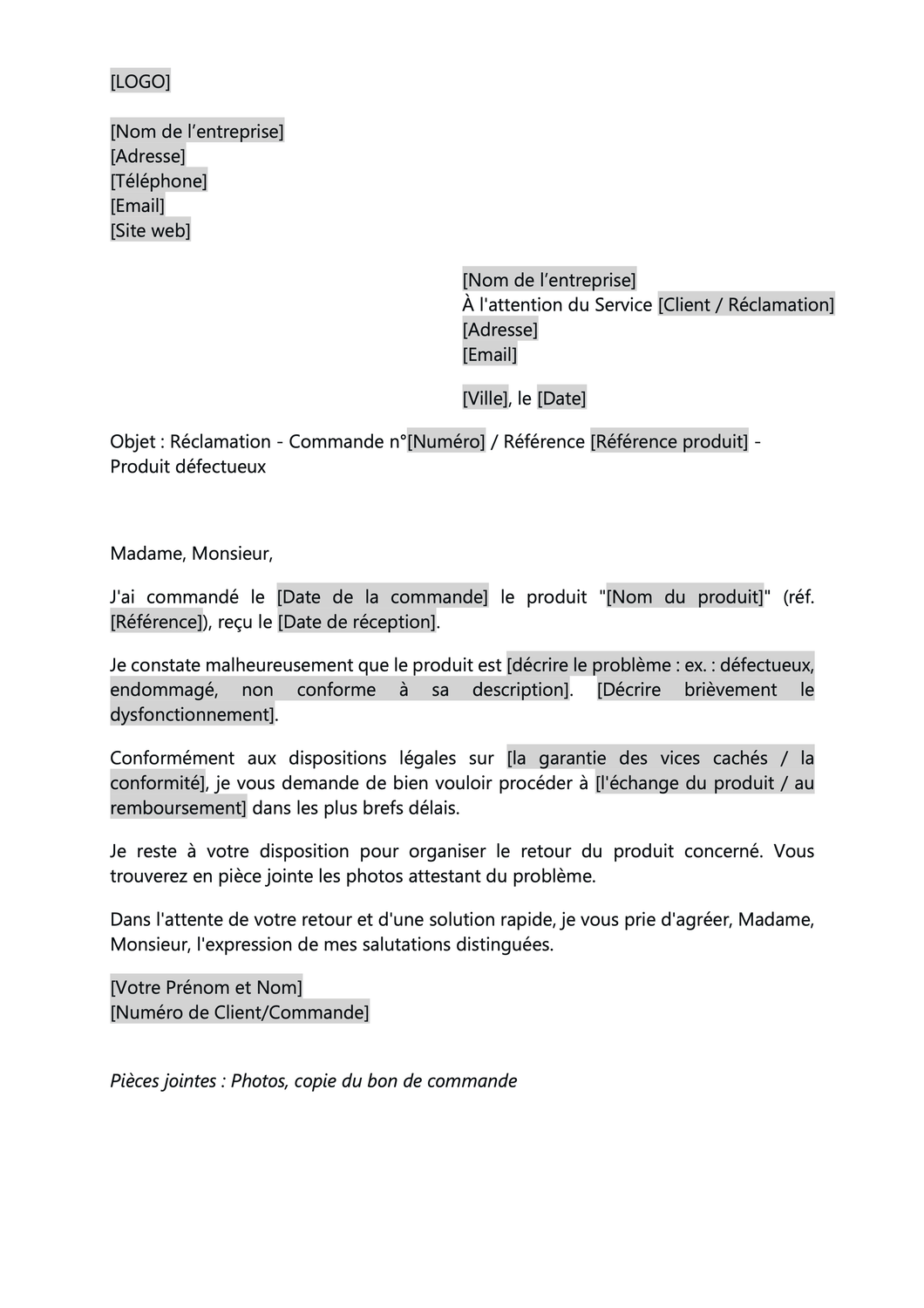 Modèle de réclamation produit défectueux, pour demander un échange ou un remboursement via la garantie légale.