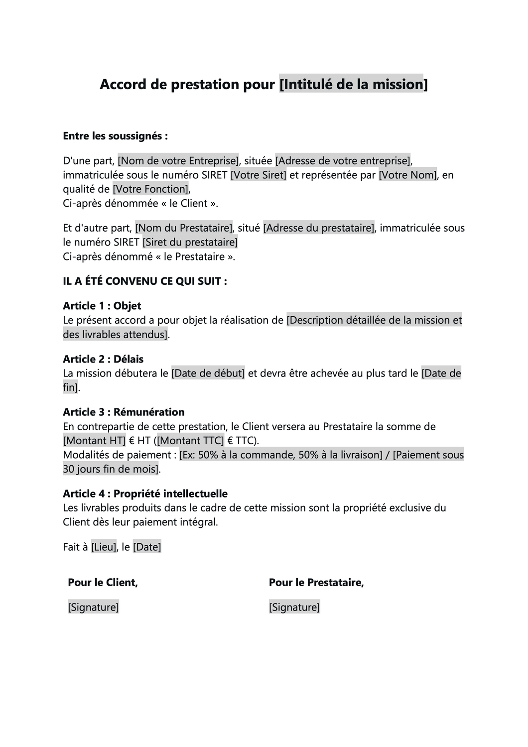 Contrat type prestation freelance. Modèle d'engagement sécurisant avec objet, délais, paiement et clause de propriété intellectuelle.