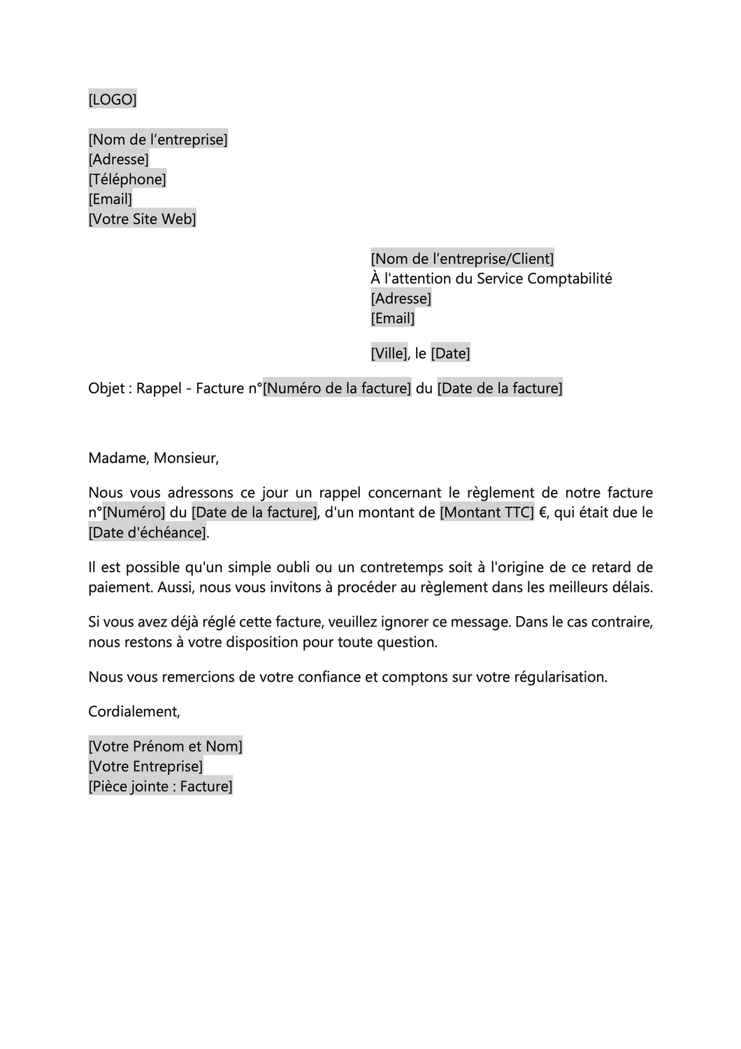 Modèle de relance de facture impayée. Message professionnel et poli pour rappeler un règlement en retard par oubli.